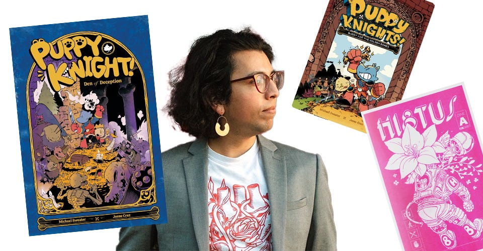 I’m constantly seeking out comics that I’ll connect with (and share my favorites with you). So how did I come across Josue Cruz? I don’t recall. It was either at the CALA convention or that I was looking for what else writer Michael Sweater had done. The important thing is I found Puppy Knight! Den of Deception because I fell in love with Josue’s charming art and delightful character designs.